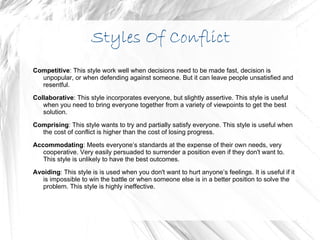 There are several styles of conflict resolution that can be used depending on the situation: - Competitive style works well for fast decisions but can leave people feeling resentful. - Collaborative style incorporates different viewpoints to find the best solution. - Comprising style tries to partially satisfy everyone's needs. - Accommodating style meets others' needs at the cost of one's own. - Avoiding style is ineffective and only useful in rare cases. Managers should let people share their perspectives, identify real issues, and set clear expectations to resolve conflicts, while employees should maintain good relationships, separate people from problems, and explore options together.