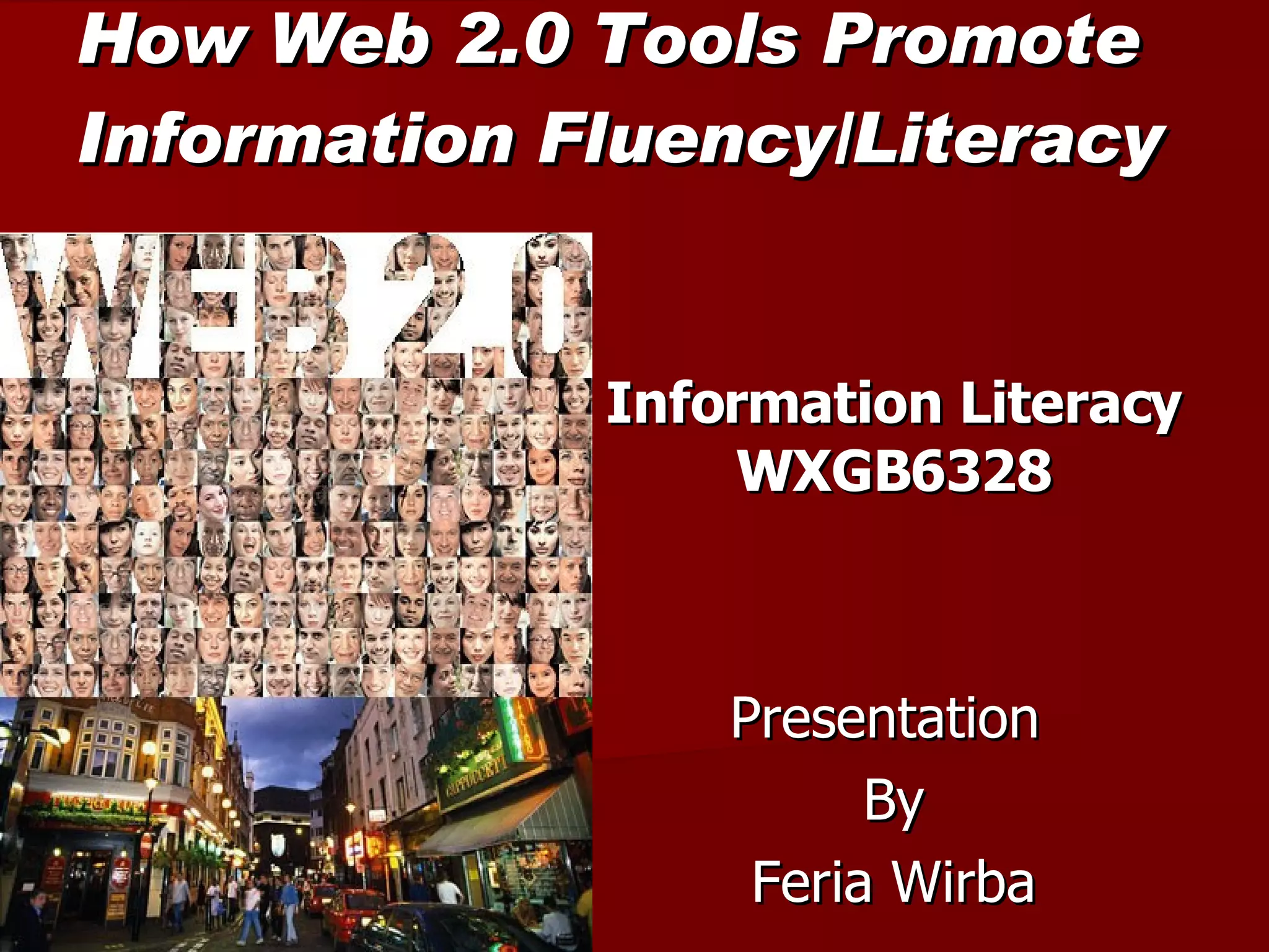 Web 2.0 tools like blogs, wikis, social networking sites, tagging, and RSS feeds promote information fluency by allowing users to create, share, and collaborate on content. These tools make information more accessible and encourage lifelong learning. While useful, overdependence on these sources and lack of skills in evaluating digital information can also be problems if information literacy is not developed.