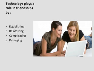Technology plays a role in friendships by establishing, reinforcing, complicating and potentially damaging them. The document discusses how social media like Facebook, MySpace and AIM are used by teens to make friends both with people they already know and potentially meet new people online, though there is debate around the safety of meeting strangers online. It also examines how social media is used to perform and potentially stress friendships through features like displaying top friends lists, managing large online friend lists and seeking attention through status updates and gossip.