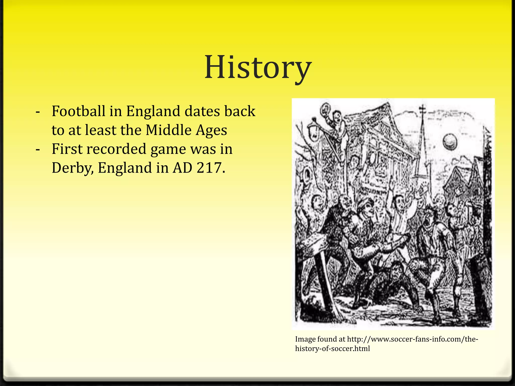 Soccer originated in England in the Middle Ages. The first recorded game took place in Derby, England in 217 AD. The rules were standardized in 1848 with the Cambridge Rules. The first international match was in 1872 between England and Scotland, ending in a 1-1 draw. A soccer game is played on a 120 by 75 yard grass field with 8 yard wide goals. A team has 11 players who play two 45 minute halves trying to advance the ball and kick it into their opponent's goal while following rules like no hands and offsides. Key equipment includes the ball, shin pads, and cleats. Famous club teams are Manchester United and Real Madrid while international tournaments include the World Cup held every 4 years and the