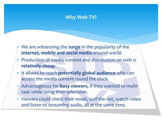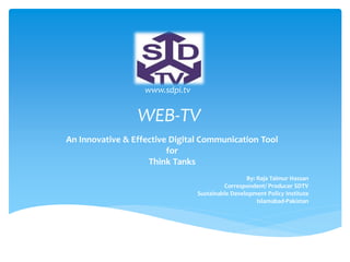 This document discusses the potential of Web-TV as an innovative digital communication tool for think tanks. It outlines how Web-TV allows think tanks to reach a global audience and disseminate their research in a visual format. The Sustainable Development Policy Institute (SDPI) in Pakistan launched their own Web-TV channel, the Sustainable Development Television (SDTV), in 2011 to highlight sustainable development issues. SDTV produces news, documentaries, and other programming to engage wider audiences and enhance SDPI's outreach. The document argues that Web-TV is an effective way for think tanks to share their knowledge and research with beneficiaries.