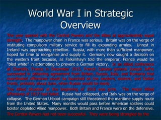 World War I began in 1914 after the assassination of Archduke Franz Ferdinand led to escalating tensions between allies. Major powers in Europe were divided into the Allied/Triple Entente powers including Britain, France, and Russia against the Central Powers of Germany and Austria-Hungary. Both sides had goals of defeating their enemies while avoiding a two-front war. The war quickly resulted in a bloody stalemate as new industrial weapons and tactics led to trench warfare on the Western Front. Over 65 million soldiers fought in the war and over 37 million casualties resulted before it ended in 1918.