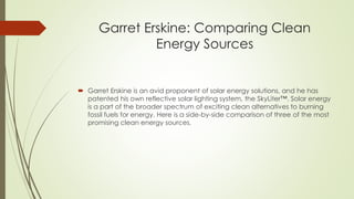 The document compares three clean energy sources: solar, wind, and hydroelectric. Solar energy is generated from sunlight and is becoming more affordable. Wind energy uses turbines in wind farms but has issues with noise and high installation costs. Hydroelectric power uses water turbines but large dams have caused environmental problems.