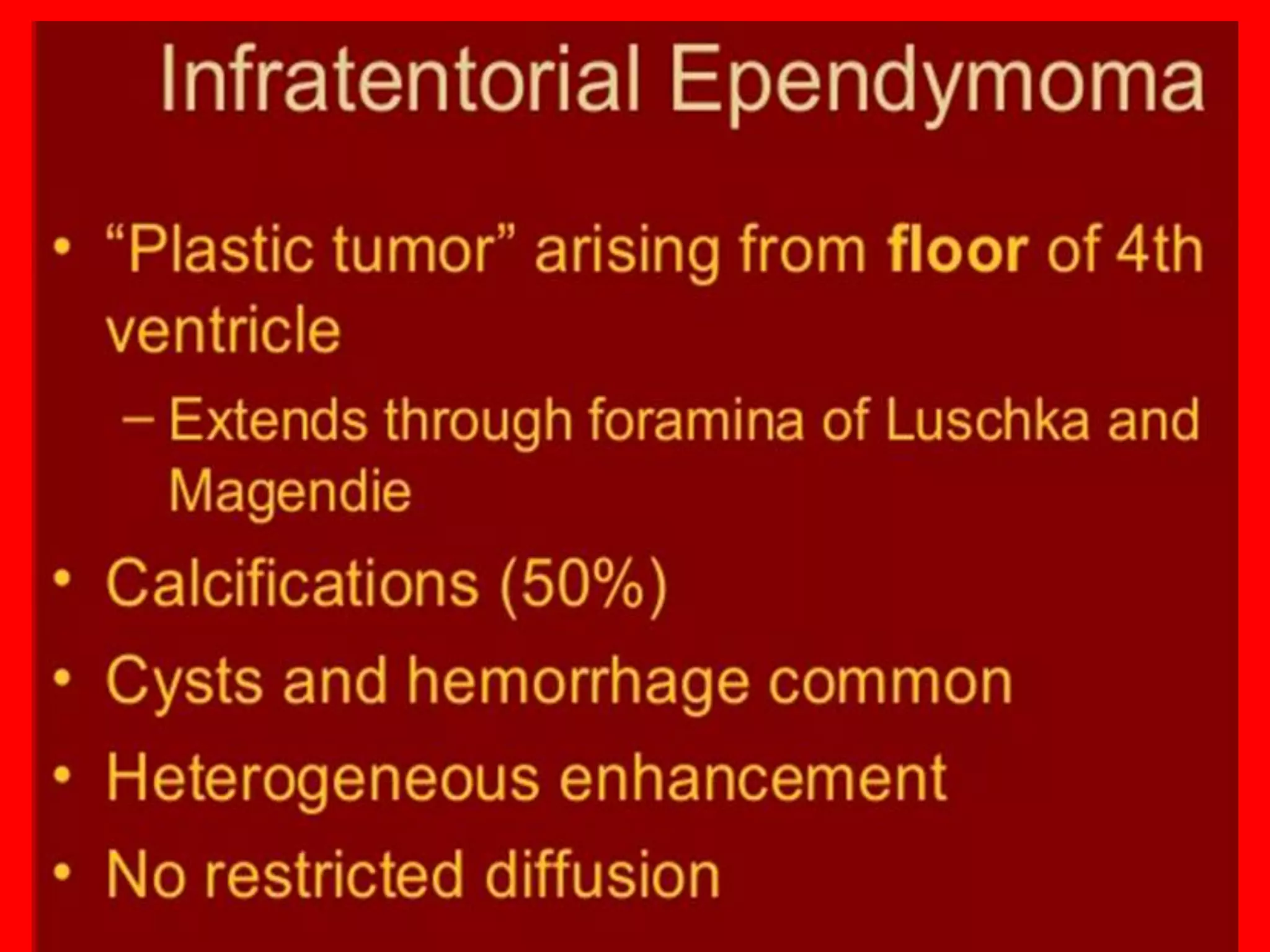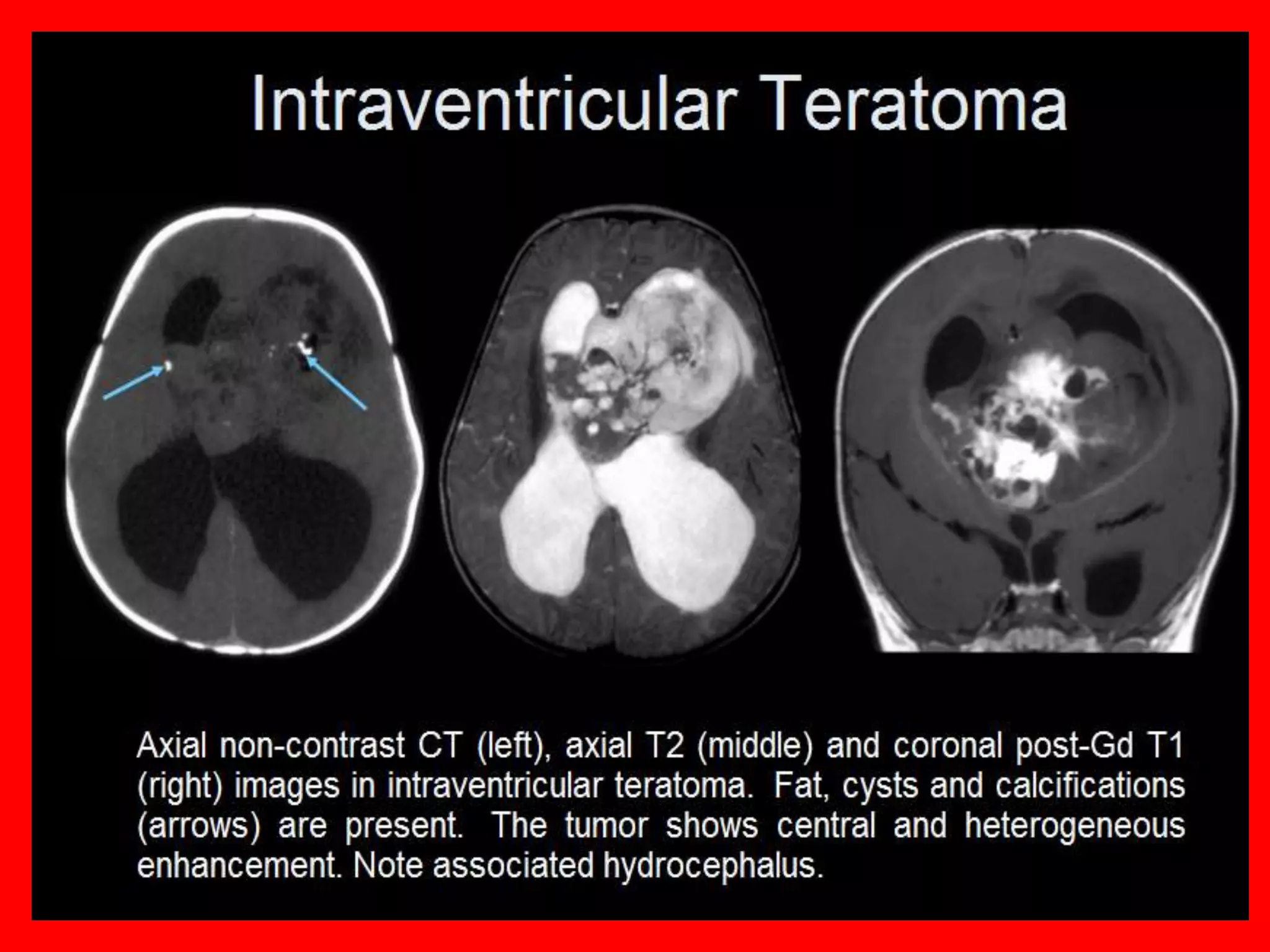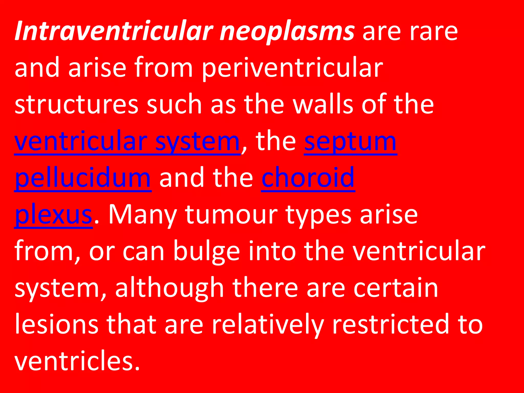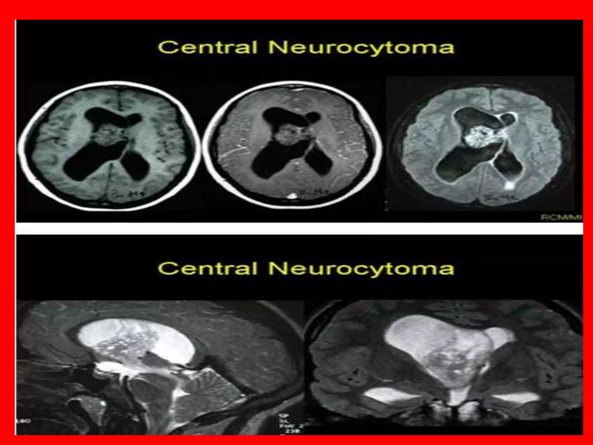 This document discusses various types of intraventricular tumors and other lesions. It describes tumors that originate from the ventricular walls, septum pellucidum, and choroid plexus, including ependymoma, subependymoma, central neurocytoma, subependymal giant cell astrocytoma, choroid plexus papilloma, choroid plexus carcinoma, and meningioma. It also discusses other intraventricular lesions like metastasis, colloid cysts, neurocysticercosis, hydatid cyst, and tuberculoma. Specific examples are provided with images of subependymoma, central neurocytoma, subependymal giant cell astro