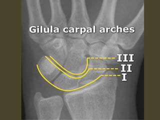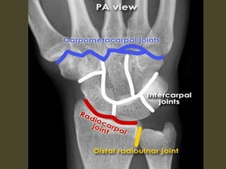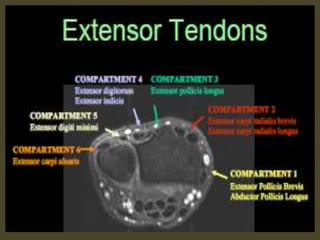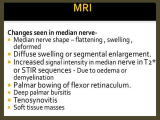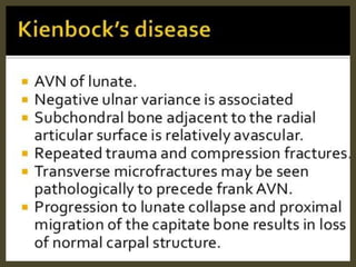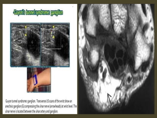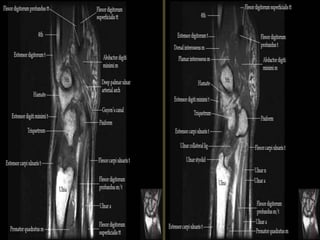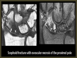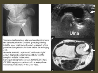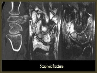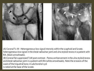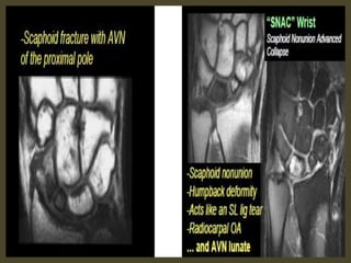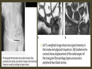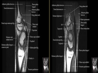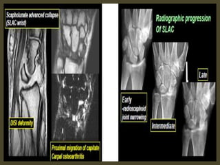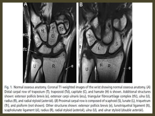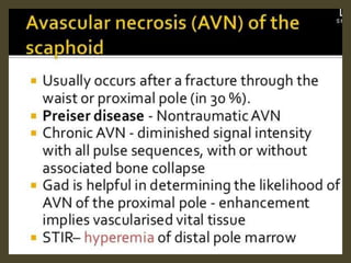 This document provides an overview of MRI indications and findings for wrist pathology. It lists common indications for MRI such as wrist instability, pain, trauma, limited range of motion, swelling and planning for surgery. It then reviews MRI sequences, anatomy, and various wrist conditions that may be seen on MRI such as fractures, ligament tears, tendon abnormalities, ganglion cysts, tumors and more. Key findings and imaging features of various wrist conditions are presented.