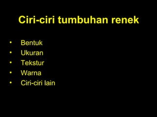 Dokumen ini membincangkan pelbagai jenis tumbuhan renek, termasuk cara pembiakan dan kaedah penyelenggaraan. Ia memberikan panduan yang terperinci tentang pembiakan melalui kaedah seperti keratan batang, tut udara, dan penyemaian biji benih. Tambahan pula, informasi mengenai spesies tumbuhan tertentu dan keperluan persekitaran mereka juga disertakan.