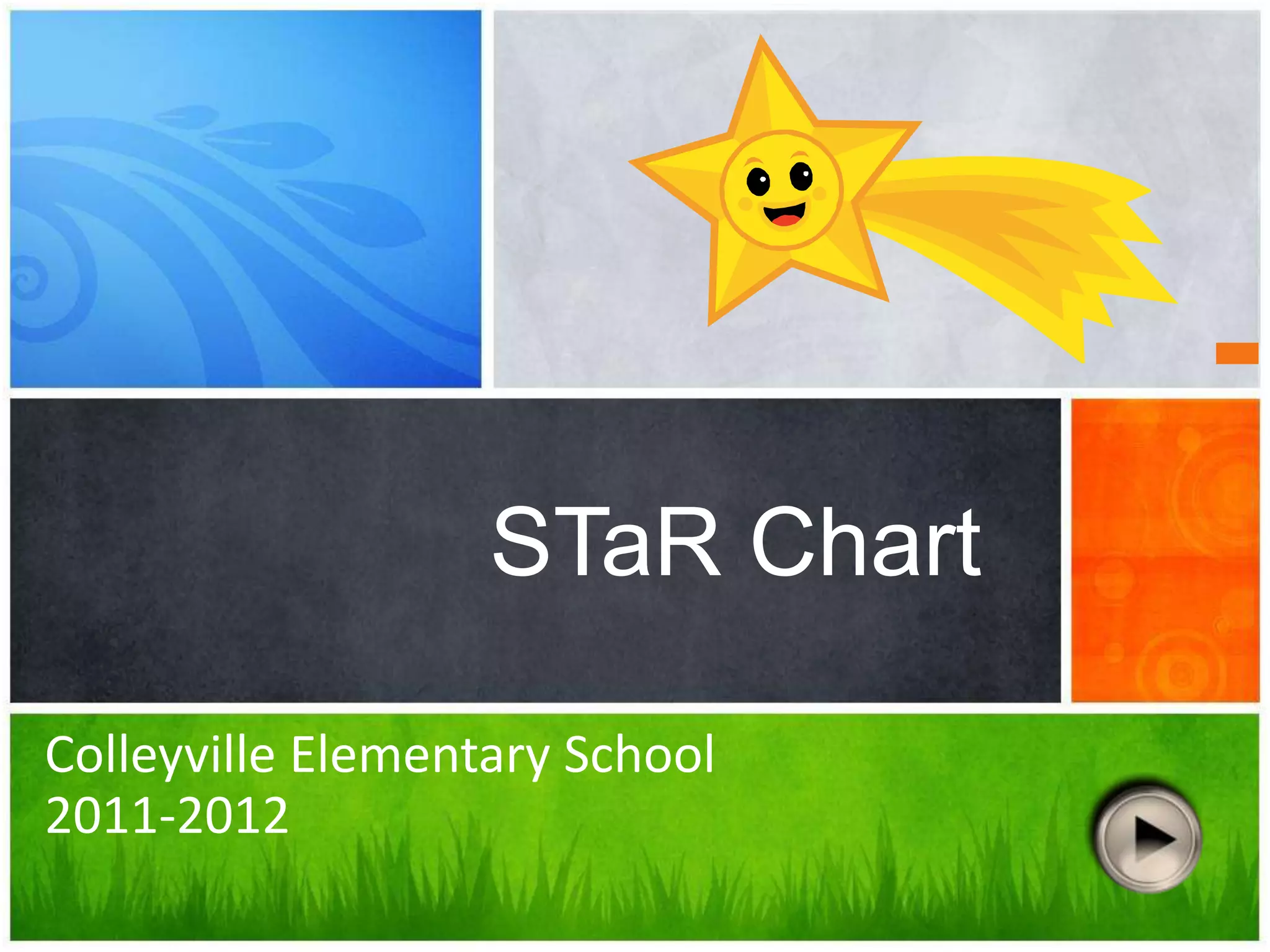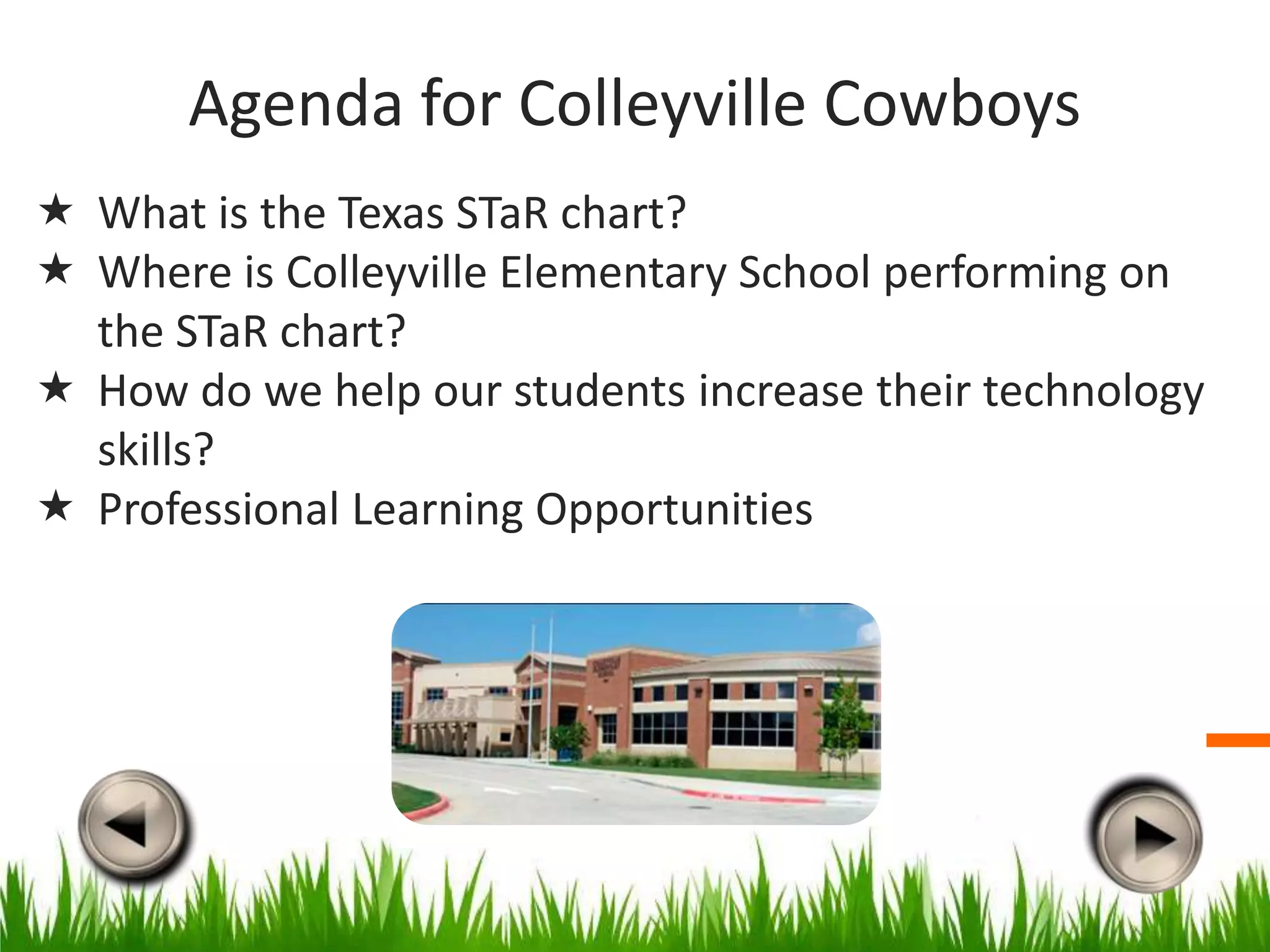 The document discusses the Texas STaR chart, which measures a school's progress in integrating technology according to the state's long-range technology plan. It summarizes Colleyville Elementary School's performance, which shows increases across four key areas from 2006-2009. While the school is advanced in areas like teaching and learning and educator development, its infrastructure is still at the target level. The presentation provides details on each area and concludes by noting the school's continued movement toward target technology levels and opportunities for professional development.