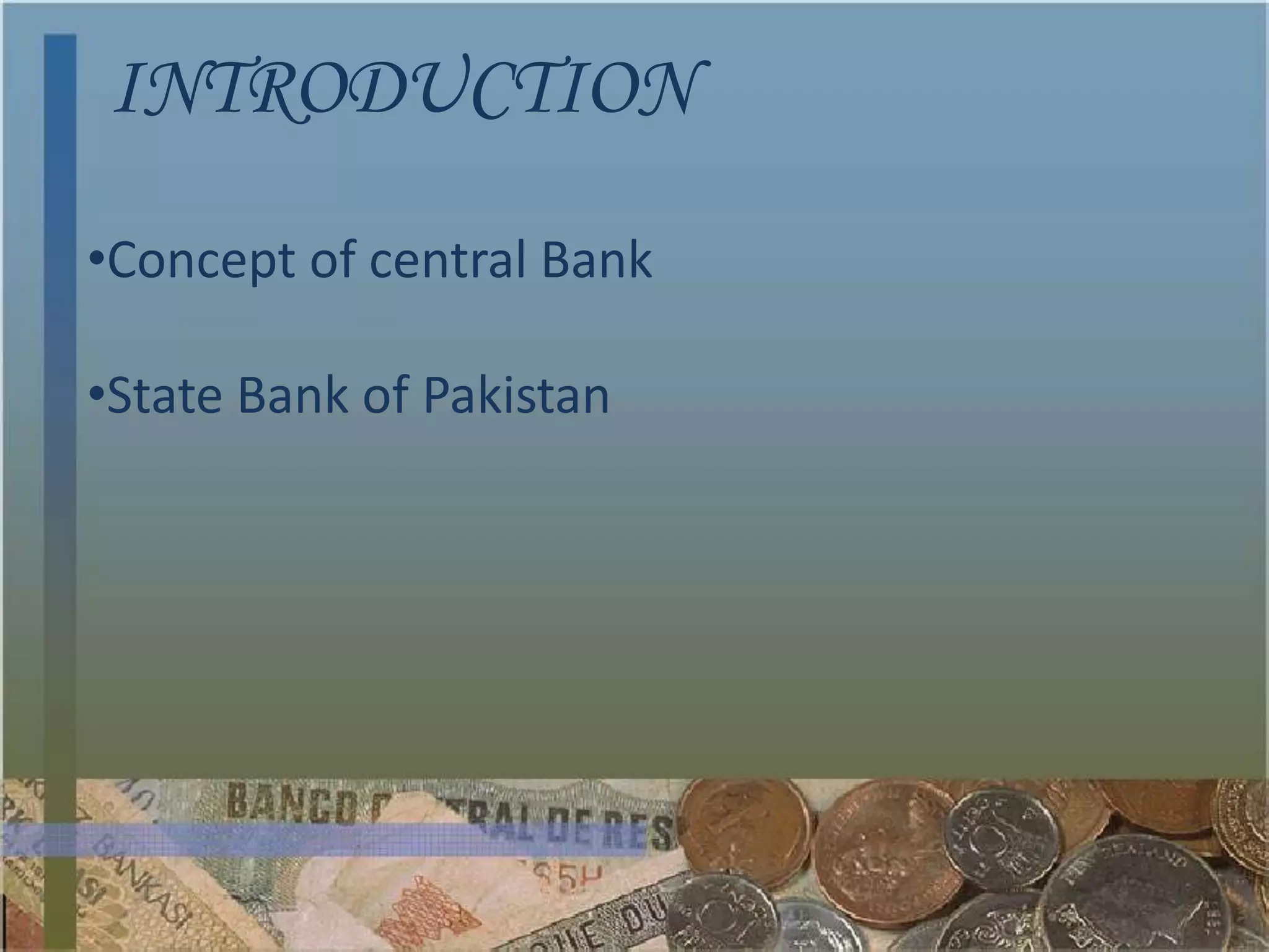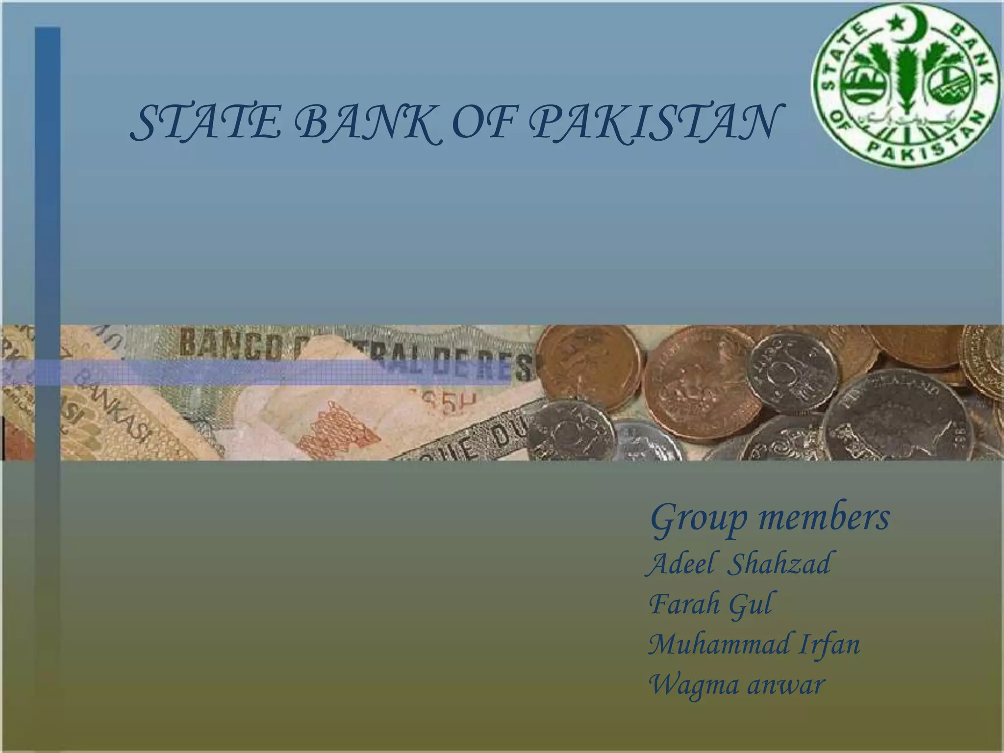 The State Bank of Pakistan (SBP) is the central bank of Pakistan. It was established in 1947 after the partition of India. SBP is responsible for monetary policy, managing foreign exchange reserves, supervising commercial banks, and providing banking services to the government. As an independent institution since 1997, SBP aims to achieve price stability and full employment through tools like interest rates, cash reserve ratios, and open market operations. It also regulates the financial system, acts as the lender of last resort, and advises the government on economic and financial matters.
