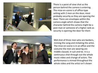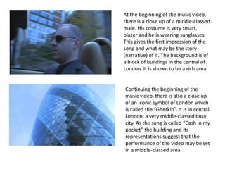 The music video takes place in central London, a wealthy area, as shown through shots of middle-class men in suits and iconic city buildings like the Gherkin. Office workers in suits mime the song throughout. Symbols like a toy Bentley car further suggest a middle-class setting and represent wealth in a cheaper way. Lyrics about "skrilla" are portrayed through a character pointing to a squirrel, indicating the middle-class is unfamiliar with slang terms. Overall the video subverts rap/grime genre expectations through its middle-class mise-en-scene and hybrid concept of an office setting narrative combined with dancing performance pieces.