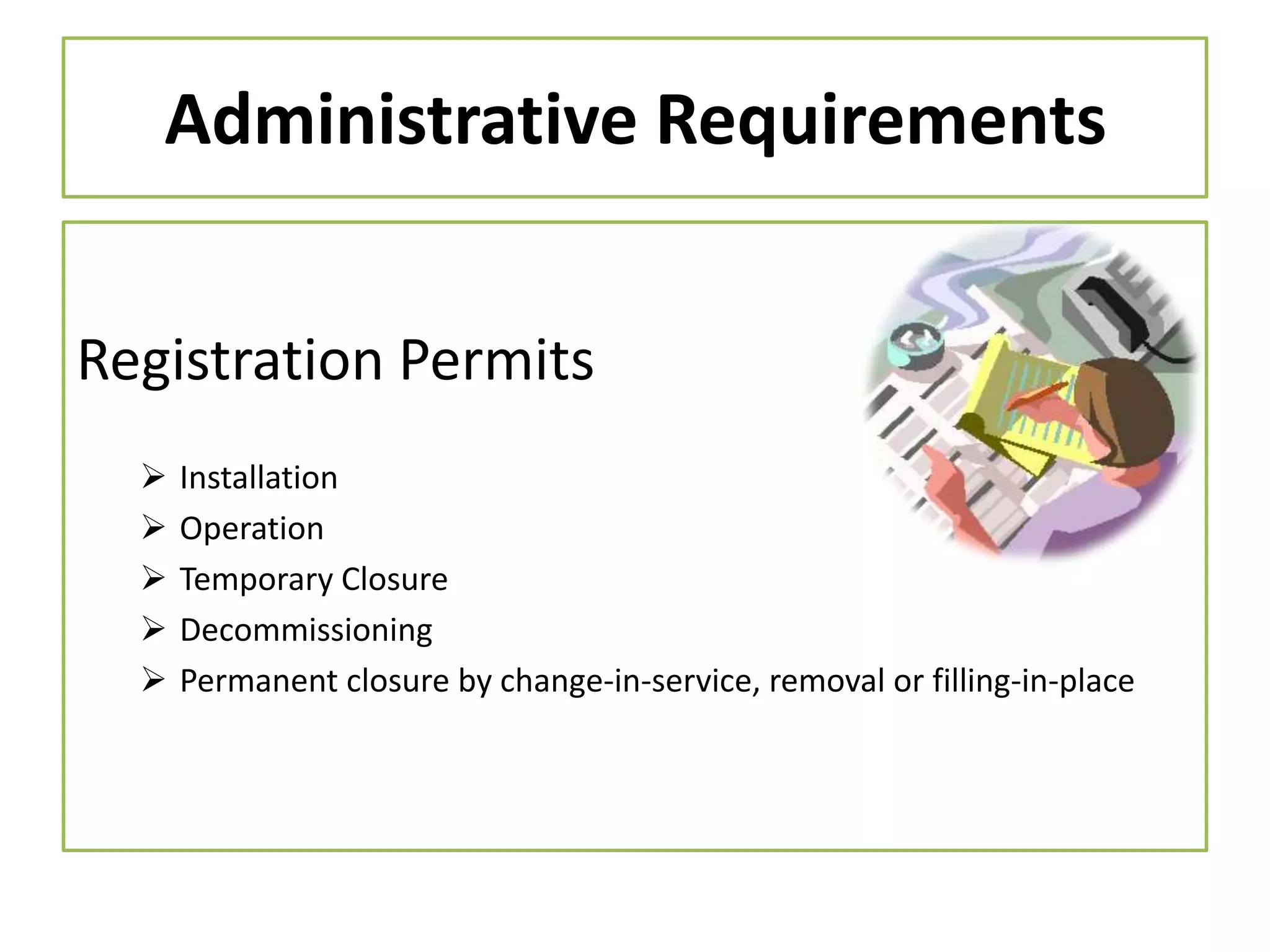 This document outlines the various permit requirements for underground storage tanks (USTs) in Washington state. It discusses the types of permits needed for installing, operating, temporarily closing, decommissioning, or permanently closing a UST through removal or filling. Notifications to the state environmental agency are required at least 30 days prior to installation, decommissioning, or certain changes. All work on UST systems must follow performance standards and be conducted by certified professionals. Permit holders must allow inspections, maintain compliance documentation and financial responsibility, report any changes or closure within 30 days, and pay annual fees. Permits can be revoked for noncompliance.