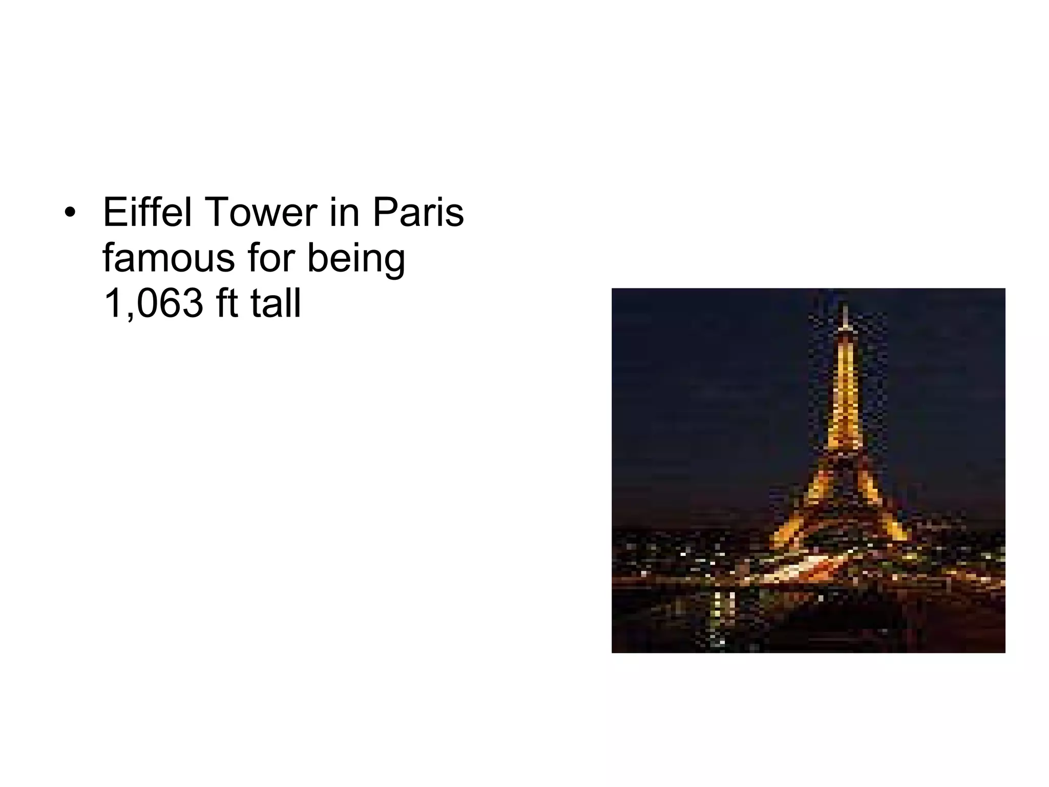 France is known for its iconic landmarks like the Eiffel Tower in Paris and Notre Dame Cathedral. It has a rich culture with palaces, famous painters like Monet and Renoir, and sports like bicycle racing. The document also briefly mentions France's currency, popular music, beaches, history of war, and famous foods like escargot.