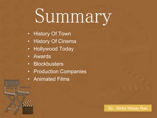 The document summarizes the history of Hollywood and the film industry. It discusses how Los Angeles transformed from a small Mexican town to the global center of cinema. It then outlines the major periods in Hollywood's history, famous actors and directors, blockbuster films, and top production companies. It also examines the growth of animated films and major awards ceremonies that recognize achievements in cinema.