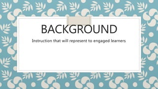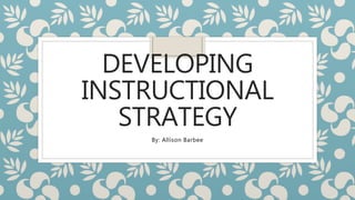 This document discusses developing an effective instructional strategy. An instructional strategy describes the components of instructional materials and procedures to enable student mastery of learning outcomes. It considers delivery system selection, content sequencing, learning components, grouping students, choosing media, and addressing different learning outcomes and maturity levels. The learning components are based on Gagne's conditions of learning and include pre-instructional activities, content presentation, learner participation, assessment, and follow-through activities. When developing an instructional strategy, one must consider factors like students' needs, abilities to collaborate, and available media and technologies to create adaptable, lifelong learning.