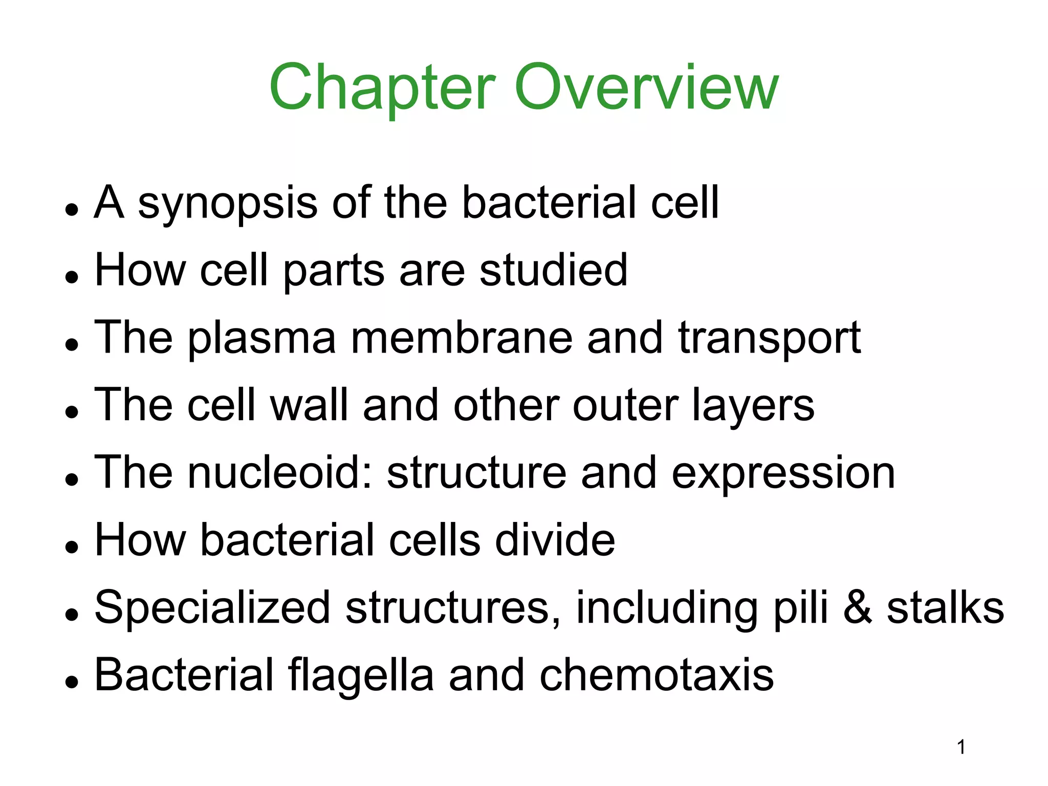 This document provides an overview of the bacterial cell, including its key parts and structures. It discusses the plasma membrane and transport mechanisms, the cell wall and other outer layers, the nucleoid which contains the bacterial chromosome, and how bacterial cells divide. Modern research techniques like cell fractionation allow scientists to isolate and study the various subcellular components that work together in a coordinated, ordered structure to carry out vital bacterial functions.