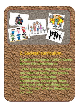 This document defines and categorizes different types of curriculum. It begins by providing the etymology and multiple definitions of curriculum. It then outlines 11 main types of curriculum: 1) overt/explicit, 2) hidden, 3) null, 4) phantom, 5) concomitant, 6) rhetorical, 7) curriculum-in-use, 8) received, 9) internal, 10) electronic, and 11) types are further explained with examples of what each entails and the lessons or messages students derive from each type. The document concludes by listing its references.
