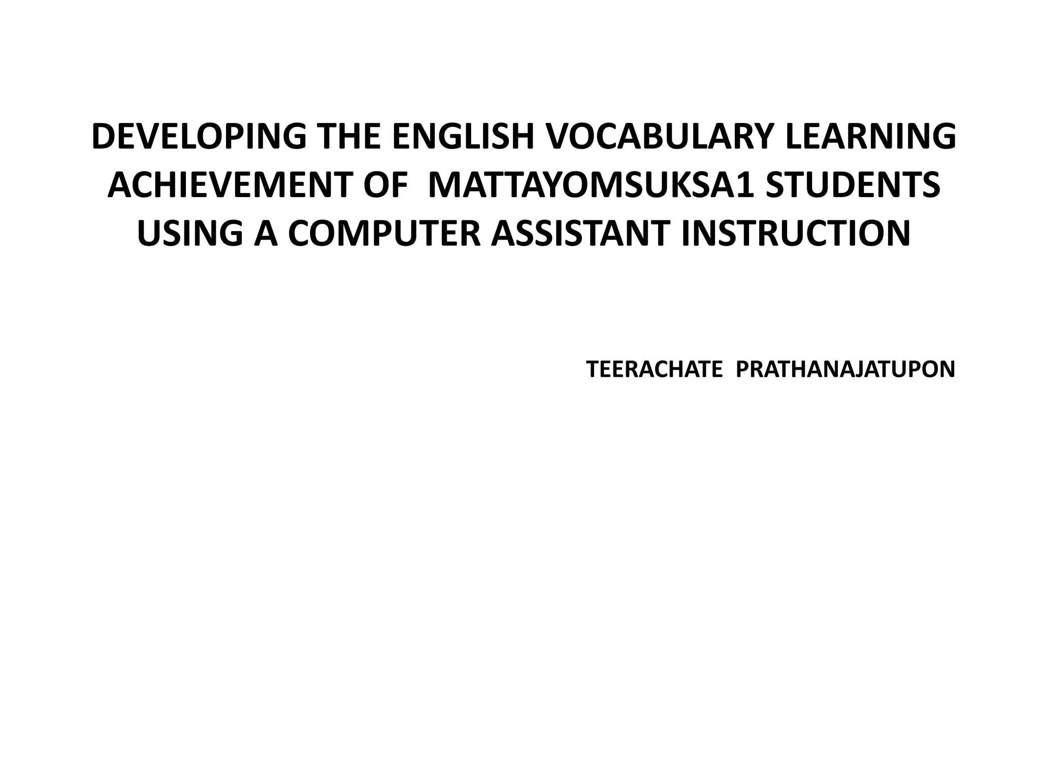 The document discusses developing English vocabulary for Mattayomsuksa1 (M1) students using computer assisted instruction (CAI). It aims to study the results of using CAI versus a teacher's manual method, and to compare the results. The population is 600 M1 students from Sakonrajwithayanukul School in Sakonnakhon, Thailand. Two classes will be randomly selected, one as the experimental group using CAI and one as the control group using the teacher's manual method. An experimental research design with randomized control group pretest-posttest and t-tests will be used.