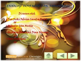 Dokumen ini membahas tentang teknologi informasi dan komunikasi, khususnya dalam penggunaan perangkat keras dan software presentasi, seperti PowerPoint. Ditetapkan dalam bentuk latihan soal dan kunci jawaban, dokumen ini mencakup cara menambah animasi, mengatur efek perpindahan slide, dan penggunaan hyperlink dalam presentasi. Materi ini dirancang untuk membantu siswa SMP memahami dan menguasai kompetensi dasar presentasi secara efektif.