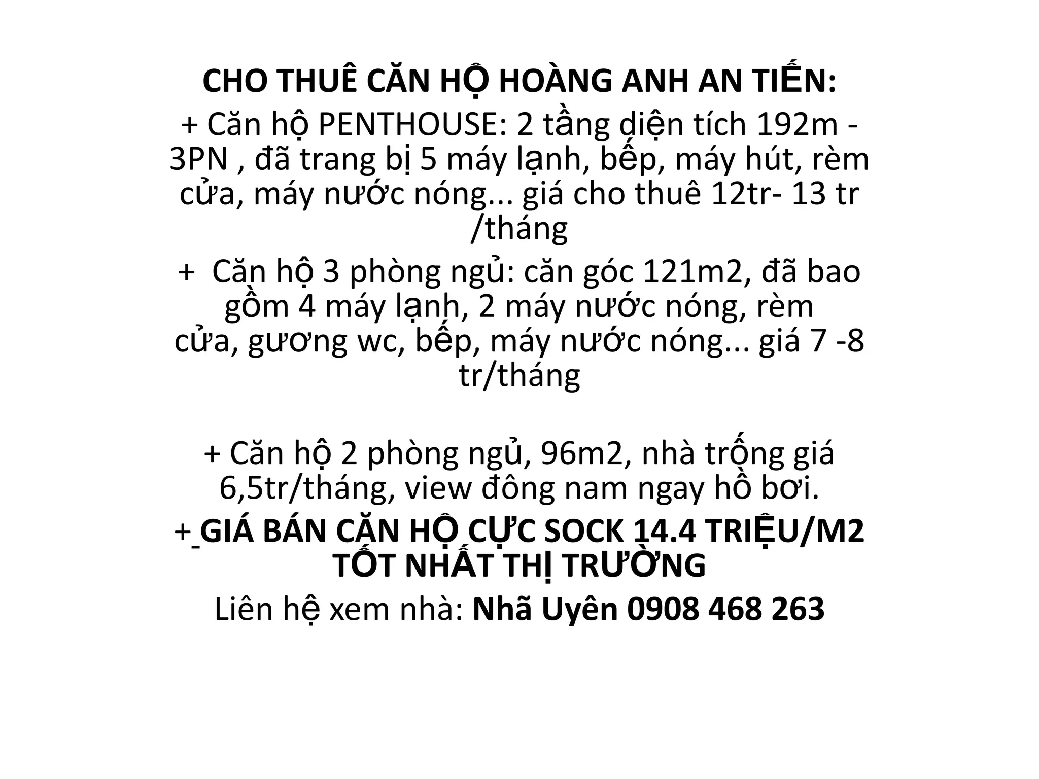 Căn hộ Hoàng Anh An Tiến cung cấp nhiều loại căn hộ cho thuê với giá từ 6,5 triệu đến 13 triệu/tháng, hỗ trợ nhiều tiện ích và vị trí chiến lược gần trung tâm thành phố. Dự án có quy mô lớn với 996 căn hộ và nhiều tiện ích như hồ bơi, sân tennis và trung tâm thương mại. Chủ đầu tư là Công ty TNHH An Tiến, dự án hoàn thành vào quý II/2012.