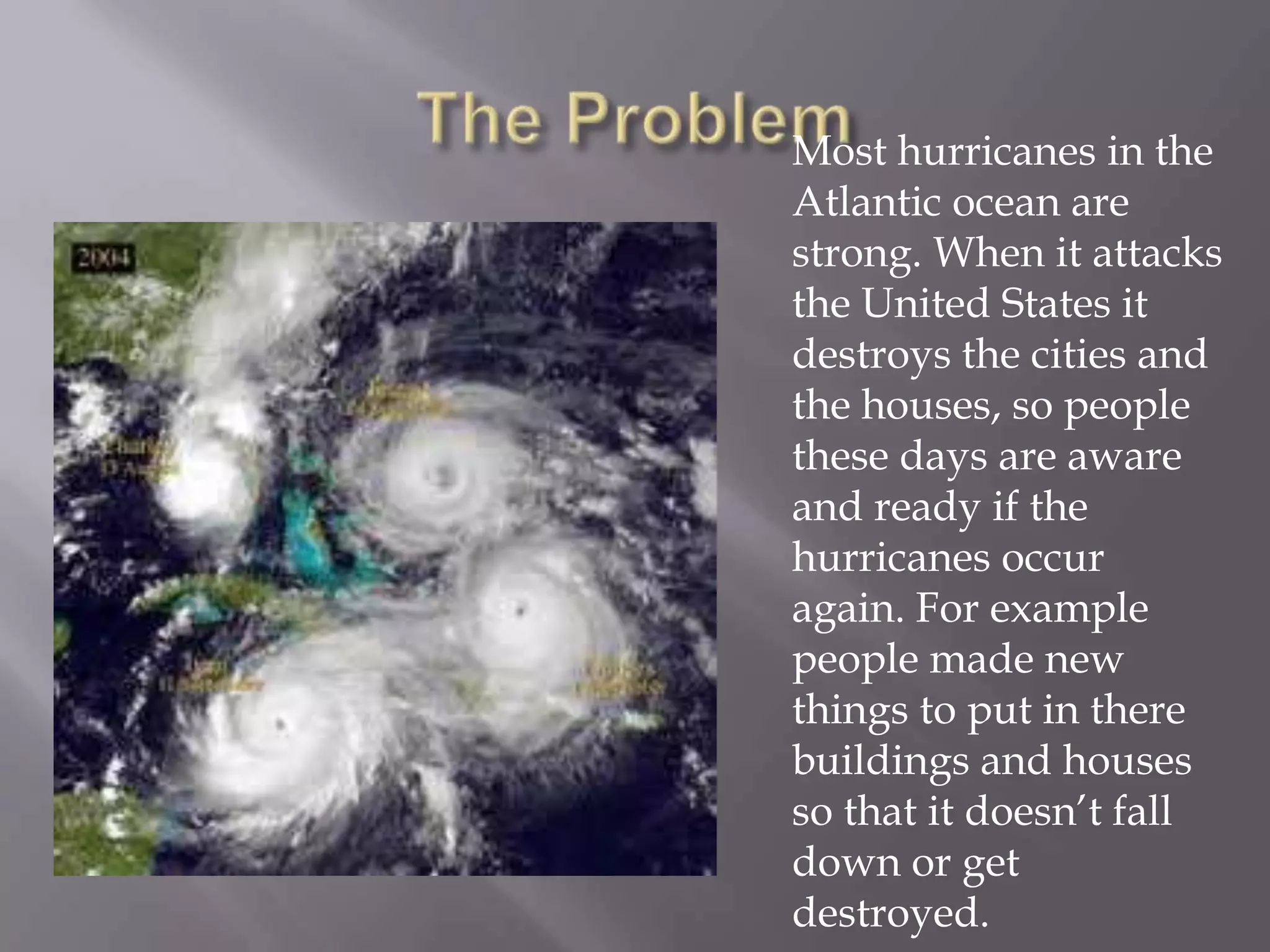 Hurricanes form over warm ocean waters and can cause extensive damage when making landfall. During hurricane season from July to November, coastal communities take precautions like improving building designs to withstand high winds and evacuating vulnerable areas when storms approach. Predicting hurricane paths and intensity remains challenging, though meteorologists monitor developing storms and issue watches and warnings to help minimize harm from these natural disasters.