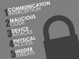 The document discusses security risks associated with mobile devices in the workplace, highlighting the potential for data loss and unauthorized access to sensitive information. It identifies five key security threats, including communication interception, malware attacks, device attacks, and insider threats. The importance of awareness and proactive measures is emphasized for companies using mobile technology.