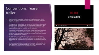 The document discusses how the media product adheres to conventions of real trailers, posters, and magazines. The teaser trailer is 53 seconds long, fitting trailer convention length. It builds tension through slow pacing. The poster uses large eye-catching text in thriller-fitting red and white. It includes taglines, social media links, and billing blocks as per conventions. The magazine cover emulates Fangoria style through dark colors and a vintage filter while highlighting past work through side strips, conforming to the magazine's conventions.