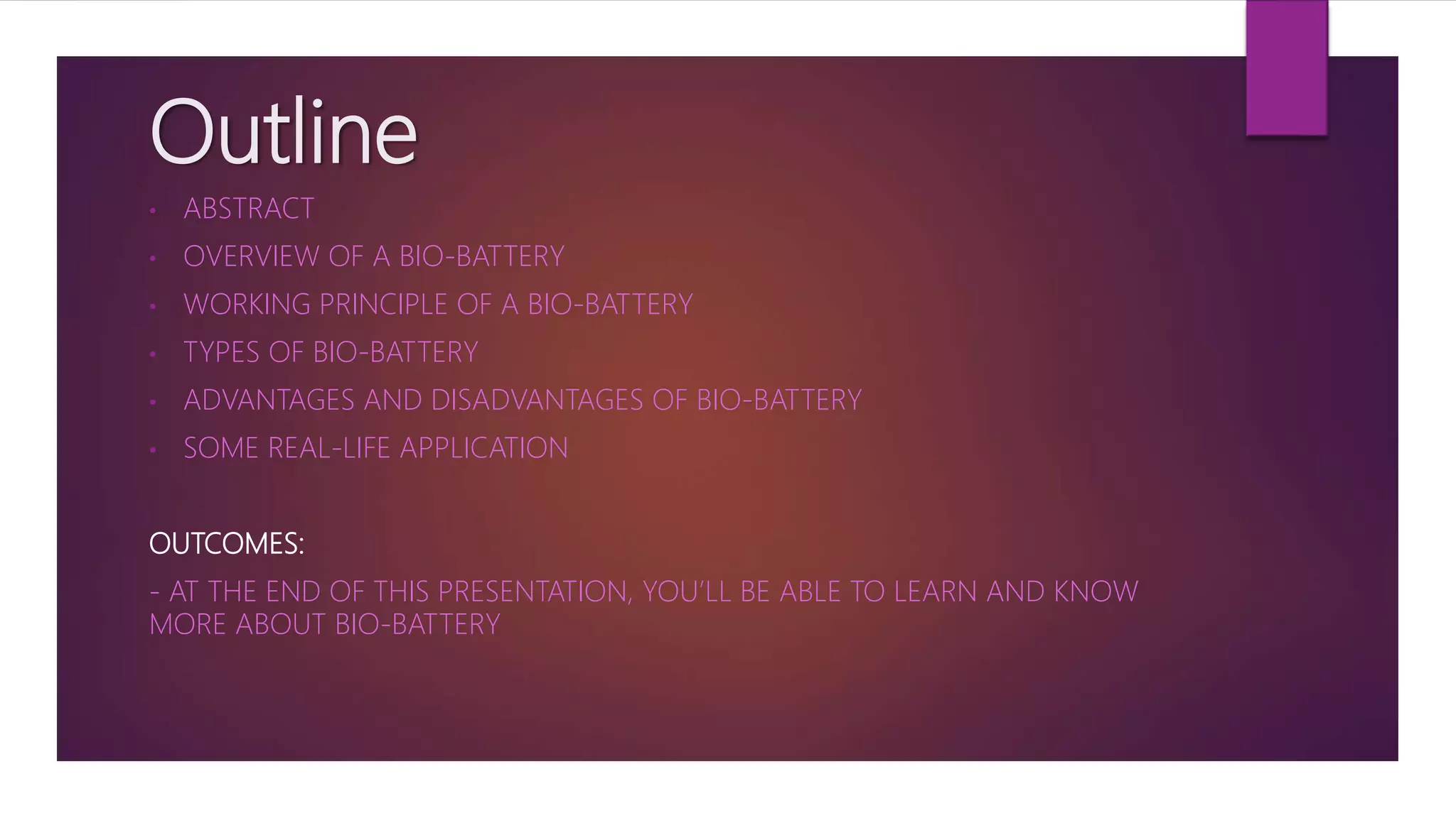 This document provides an overview of bio-batteries, including their working principle, types, advantages, disadvantages, and applications. Bio-batteries generate electrical energy through chemical reactions involving organic compounds like glucose, and include enzymes or microorganisms to break down substrates. There are two main types - enzymatic bio-batteries that use enzymes, and microbial bio-batteries that use microbes. Bio-batteries have advantages like being renewable, non-polluting, and safe, but store less energy than lithium batteries and cannot be used for long-term storage. Applications include powering medical implants, electronics, toys, and remote sensing devices.