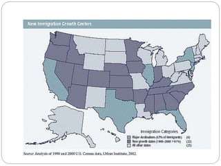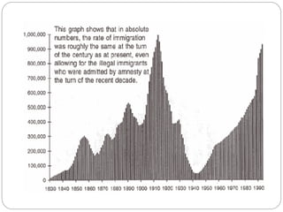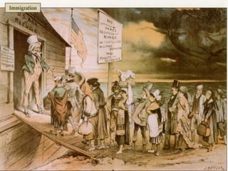 The document provides background information on immigration to the United States in the late 19th and early 20th centuries. It discusses how employers relied on immigrant laborers from Asia who could not become citizens, as well as temporary Mexican workers. Prejudice against Asian immigrants led to the Chinese Exclusion Act of 1882. Immigrant processing centers like Ellis Island screened newcomers. While immigration was initially encouraged, nativist sentiment grew and Congress passed laws in 1921 and 1924 setting immigration quotas.