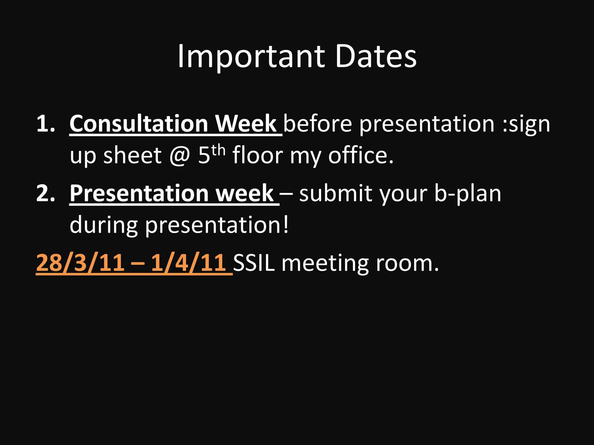 1) Important dates for consultation week and the presentation week in March and April where teams must submit their business plans.