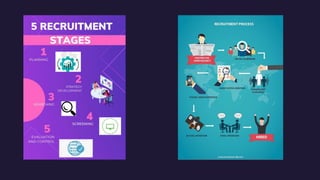 The document discusses recruitment strategies and processes. It defines recruitment as acquiring applicants for jobs and internships. The recruitment process involves planning, developing strategies, searching for candidates, screening applicants, evaluation, and reference and background checks. The key stages are planning job needs and sources, activating sources to generate applications, screening candidates, and selecting the most qualified people. Recruitment is important for organizations to procure skilled and capable employees for success.