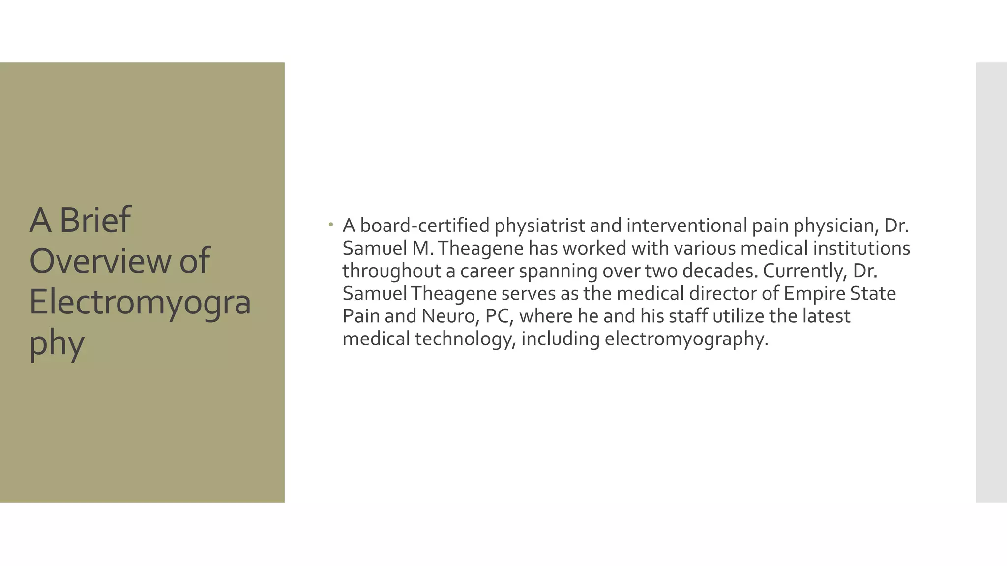 Electromyography (EMG) is a diagnostic test that assesses muscle and nerve health by measuring electrical activity in muscles. During an EMG, a provider inserts small needle electrodes into a patient's muscle to record electrical signals both at rest and during muscle activation. The test helps evaluate conditions causing tingling, numbness, and weakness. It takes 30 to 60 minutes to complete and may cause minor bruising or tenderness at the needle sites.