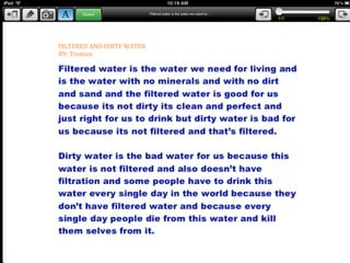 The students investigated issues with drinking water around the world. They found that over 884 million people lack access to safe drinking water, including countries like Afghanistan and Ethiopia where less than 25% of the population has clean water. The students also explored how the US filters water differently than other nations. They conducted an experiment boiling water in different containers and learned glass containers with lids boil water fastest. Their conclusion was that access to safe drinking water is a major global problem and boiling salt water can produce drinkable water in places without filtration.