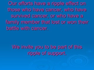 Mayor Oberlie's campaign against cancer aims to raise awareness about breast and prostate cancer, emphasizing early detection and risk reduction. The campaign includes various community initiatives such as the 'Community Project in Pink,' the annual 'Plunge for a Cure,' and a chili cook-off, all aimed at promoting cancer awareness and fundraising for cancer organizations. Volunteers play a crucial role in distributing information and resources, affecting many families impacted by cancer in the community.