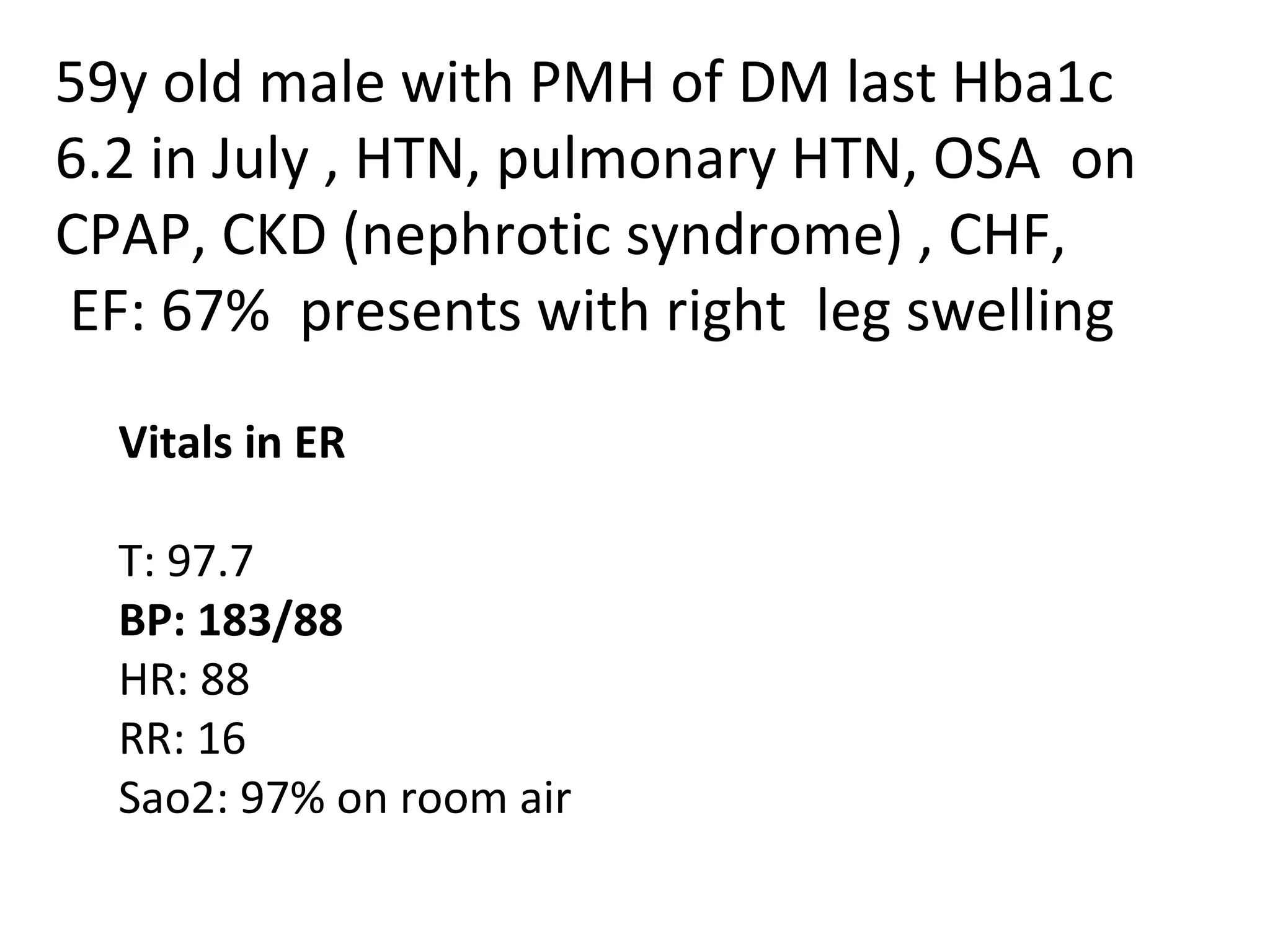 This document summarizes the evaluation and treatment of a 59-year-old man presenting with right leg swelling and edema. It notes his medical history including diabetes, hypertension, pulmonary hypertension, sleep apnea, chronic kidney disease, and congestive heart failure. It discusses diagnostic testing performed, including a positive D-dimer and imaging, and treatment options for deep vein thrombosis including anticoagulant medications like warfarin, heparin, and fondaparinux as well as interventional procedures like IVC filters and thrombolytic therapy in certain situations.
