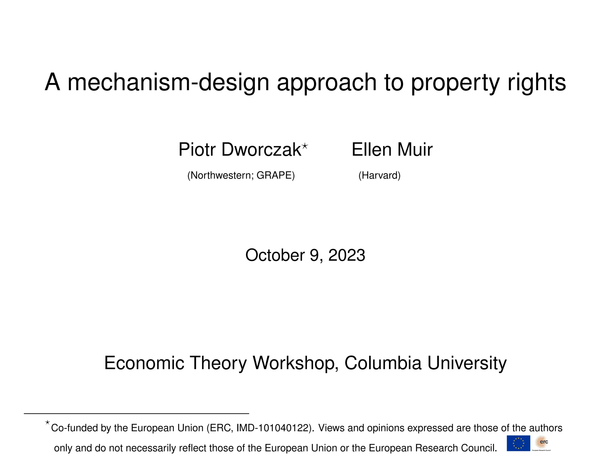 The document presents a framework for studying the optimal design of contractual property rights. It discusses how property rights determine agents' outside options in economic interactions and impact ex-post efficiency and investment incentives when a social planner cannot commit to future mechanisms. The authors' contribution is characterizing the optimal property right from a non-parametric class in a setting with one-sided private information and bargaining power, finding that flexible rights featuring an option to own are often optimal.
