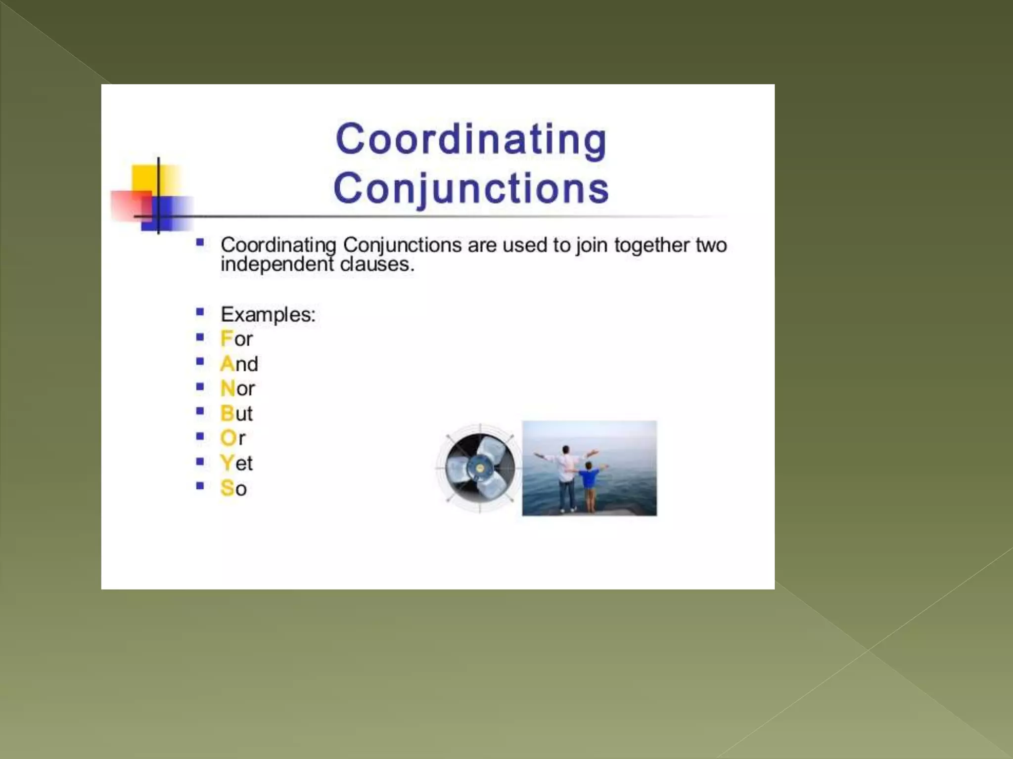 This document discusses coordinating conjunctions, which are conjunctions that join words, phrases, or independent clauses of equal rank. The seven most common coordinating conjunctions are and, but, yet, for, so, or, and nor. These conjunctions are used to communicate addition, contrast, result/effect, reason/cause, choice, or negative choice. Less commonly used coordinating conjunctions include consequently, furthermore, however, indeed, moreover, nevertheless, then, and therefore. Examples are provided to illustrate how coordinating conjunctions join words, phrases, and independent clauses.