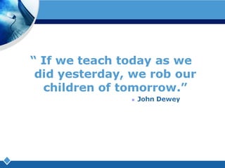 The document discusses the importance of technology in classrooms based on various studies. It argues that technology improves cognitive thinking skills, prepares students for the workplace, and increases student motivation and test scores, when it is high-quality and integrated into lesson plans. Studies cited found that students using technology scored 64% higher on tests and developed more positive attitudes towards classes when technology was used. The conclusion is that technology can improve cognitive development, grades, motivation, workforce skills, and help produce well-rounded students, when implemented effectively in classrooms.