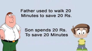The document discusses the generation gap between parents and children. It defines the generation gap as differences between younger and older generations, especially between children and their parents. It lists some reasons for the gap, such as parents not treating children age-appropriately, differences in ideas, and parents not being aware of the modern world. The document provides recommendations for bridging the gap, including proper communication, understanding different perspectives, spending quality time together, and showing care and love.