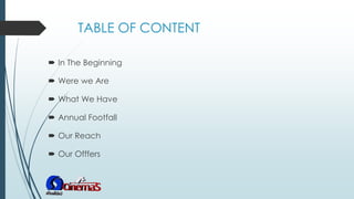 This document provides information about Silverbird Cinemas, the leading cinema chain in West Africa. It discusses the company's history and growth over 12 years from opening its first 5-screen cinema in Lagos in 2004 to now having 9 locations across 2 countries and 4 Nigerian states. It details the number of screens and seating capacity at each location, as well as annual footfall numbers. The document then outlines Silverbird Cinemas' reach through its sister companies Silverbird Television and Rhythm FM. Finally, it proposes several sponsorship and branding offers for partners to leverage Silverbird Cinemas' large audience and network.