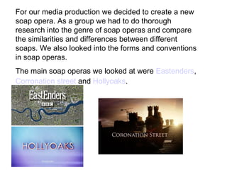 The document discusses a group's media production of a new soap opera. They researched popular soap operas like Eastenders, Coronation Street, and Hollyoaks to understand conventions of the genre. Their new soap opera aims to be both socially realistic and light entertainment, similar to Hollyoaks. It focuses on issues like abuse and drug use that teenagers can relate to. The setting of a university also allows their target audience of 16-34 year olds to easily relate. They plan to film multiple trailers showing different storylines and characters to target different audiences like males and females, teenagers and young adults. While including standard soap opera character types, they also challenge conventions to avoid simply copying other shows.