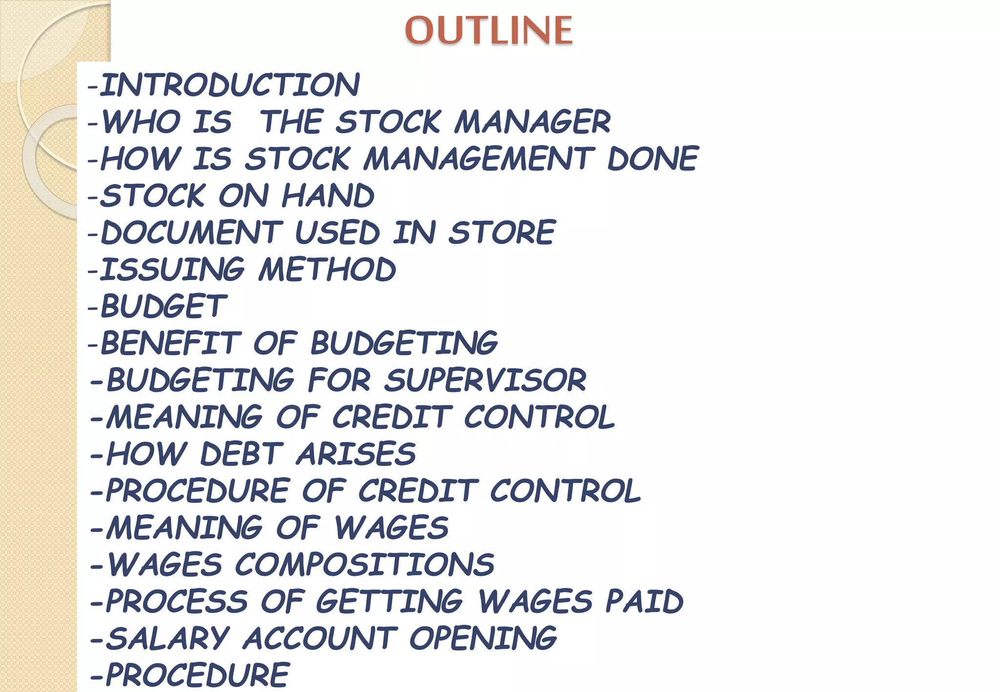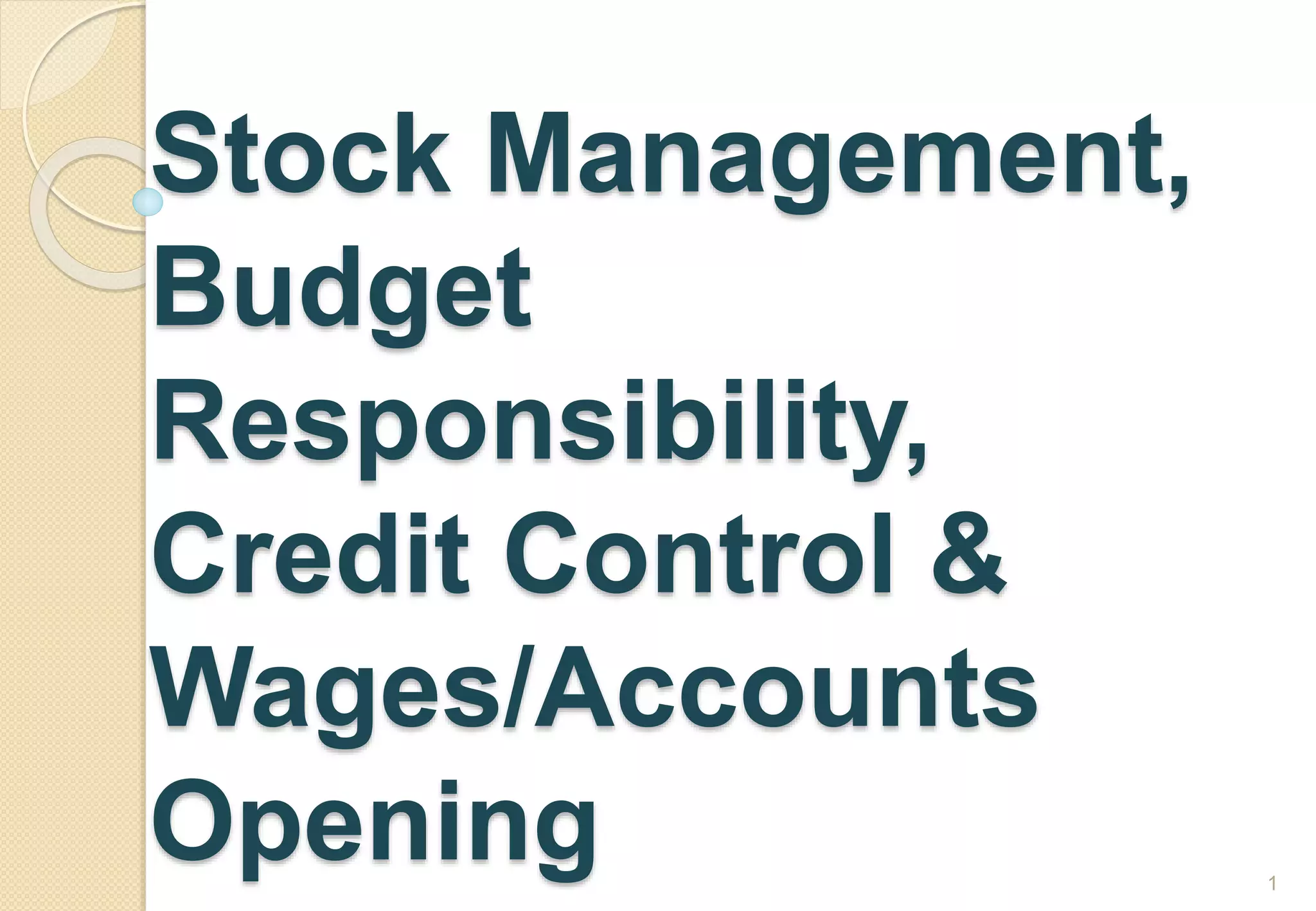 This document outlines responsibilities and procedures related to stock management, budgeting, credit control, and wages/accounts for a field supervisor. It discusses who manages stock and how, including documents used and issuing methods. It defines budgeting and its benefits, and how supervisors can budget. Credit control aims to increase sales by extending credit to qualified customers while minimizing risks. Procedures for credit control include invoice processing and payment monitoring. Wages are defined and composed of basic pay plus allowances. The process for staff to receive wages and open a salary account is also outlined.