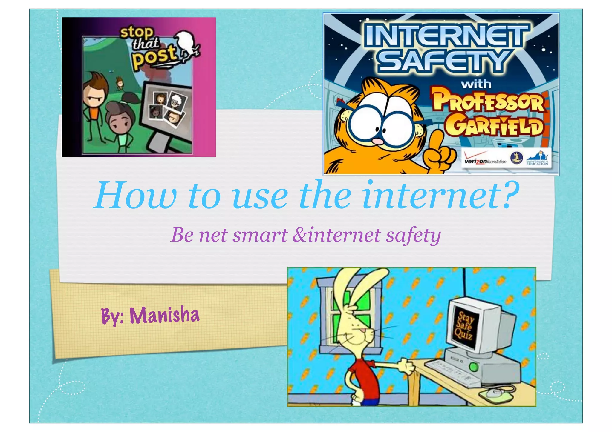 The document provides tips for internet safety and discusses potential dangers online called "wizzywigs." It describes three main activities one can do on the internet: communication through apps like Skype and Facebook, entertainment like games and YouTube, and education using search engines and online videos. It then outlines five types of wizzywigs to watch out for, including Spamazoid who sends spam emails, Follow You Fiona who tries to get personal information, Hot Head who engages in cyberbullying, Oogle who wants passwords to sell information, and Numbut who spends too much time online. The document concludes by listing tips to stay safe such as not sharing information with or befriending strangers.