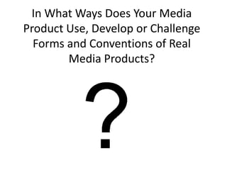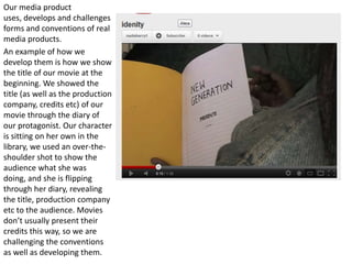 The media product uses, develops, and challenges conventions of real media. It develops conventions by showing the title through a diary being flipped through. It challenges conventions by doing this rather than typical title presentation. It uses conventions like establishing shots to set the scene and introduce the protagonist. The product challenges conventions by having a dual protagonist, one of whom is a black female, which expands its audience. It was influenced by the film Juno and aims to capture a similar atmosphere.