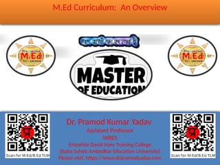 The document outlines the two-year M.Ed. program developed by Dr. Pramod Kumar Yadav, detailing course structure, examination policies, marks distribution, and eligibility criteria for students. It specifies requirements for credits, attendance, practical work, and grading system, emphasizing that students must achieve a minimum score in each course to progress. The program aims to prepare students with a comprehensive educational background through structured evaluations and rigorous academic standards.