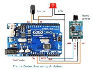 This presentation introduces a fire alarm system built using an Arduino board. It discusses how fire alarm systems save lives and property by reducing damage. The key components needed are a flame sensor, Arduino, breadboard, LED, buzzer, and connecting wires. The flame sensor interfaces with the Arduino to detect flames, and triggers the LED and buzzer which are also connected to the Arduino to alert of a fire. The system is programmed using the Arduino IDE.