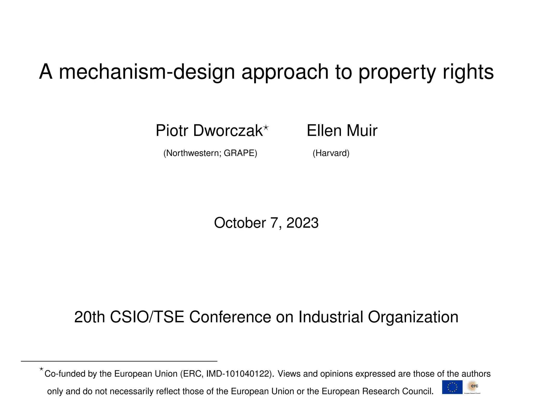 The document presents a framework for studying the optimal design of contractual property rights. It discusses how property rights determine parties' outside options in economic interactions and impact efficiency and investment incentives. The framework models an interaction where a property rights holder participates in a trading mechanism. The optimal property right balances ex-post inefficiency and hold-up problems arising from the planner's inability to commit. The paper contributes by characterizing the optimal right from a non-parametric class of options and provides a foundation for why option-to-own contracts are attractive.