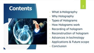 This document discusses 3D holographic projection technology. It begins by defining holography as a technique that records and reconstructs light scattered from an object to preserve its 3D information. It then covers the basic components and process for recording and reconstructing holograms, as well as advances and applications of the technology. Key points include: holograms allow for glasses-free 3D displays without a projection screen; recording involves splitting a laser beam between an object and reference beam which interfere to imprint a pattern on film; reconstruction illuminates the film to regenerate the 3D image. Future applications may include improved virtual and augmented reality, telepresence, and holographic displays replacing all screen types.
