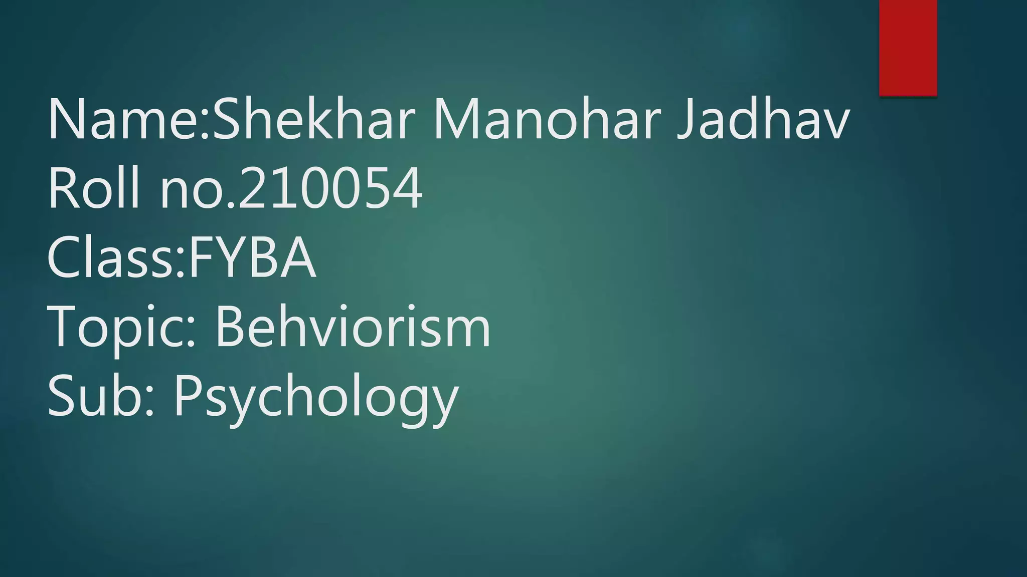 This document provides an introduction to behaviorism in psychology. It discusses key aspects of behaviorism such as defining behavior as responses to external stimuli that can be observed, the view that the mind is a "black box" that cannot be observed, and the idea that learning is defined as behavior changes due to environmental experiences. The document also summarizes the history of behaviorism including the influential work of John Watson and B.F. Skinner, and discusses concepts like classical conditioning, reinforcement, and how behaviorism influenced education with a focus on external motivation and reinforcement of behaviors.