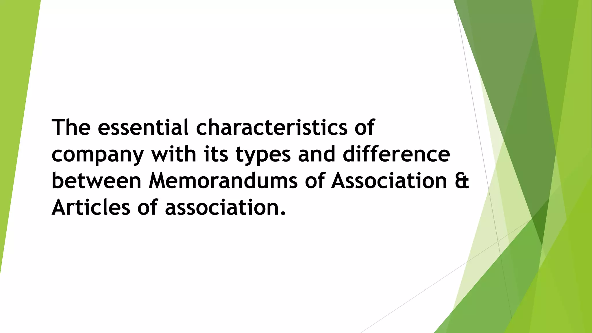 A company is defined as an artificial legal entity created under the Companies Act. It has key characteristics such as being a separate legal entity, having perpetual existence, limited liability for members, and separation of ownership and management.