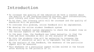 The document describes a proposed online student feedback system developed using Python. The system aims to address issues with the previous manual feedback process, which took more time and was more difficult to analyze. It allows students to provide feedback on various college aspects like faculty, subjects, and facilities through an online web application. Administrators can then automatically generate reports on the feedback to identify weaknesses and opportunities for improvement to enhance the quality of education.