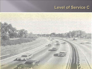 The document presents a study on quantifying the level of service of a typical two-lane highway. Traffic data was collected through classified volume counts, spot speed surveys, and videographic techniques on NH-44 near Agartala, India. Analysis of the data showed hourly traffic variations with peak periods. Speed distributions were established and fitted to normal curves. Vehicle arrival patterns were found to follow a Poisson distribution. Speed-flow relationships were developed using regression analysis. The study aims to help establish parameters for evaluating level of service on two-lane highways with mixed traffic conditions.